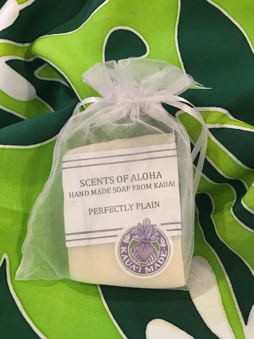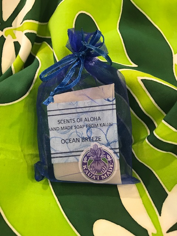 Handmade on Kaua'i, Scents of Aloha soaps use no artificial dyes or coloring. These are natural soaps, composed of pure glycerin and infused with macadamia oil, kukui nut oil (SPF 6), cocoa butter, cocoa shea butter (SPF 10), and fragrance oil. Each soap is hand cut to 4.3 oz (+/-)