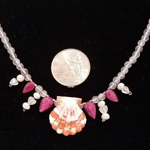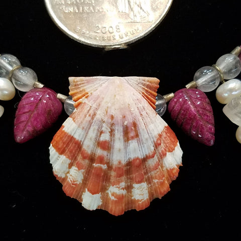This Red Sunrise Shell with paired with ruby leaves and rose quartz