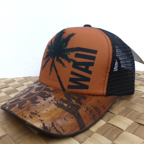 Koa Wood Black Mesh/Snap back Hawaii Coconut Tree & Sunburst Rim